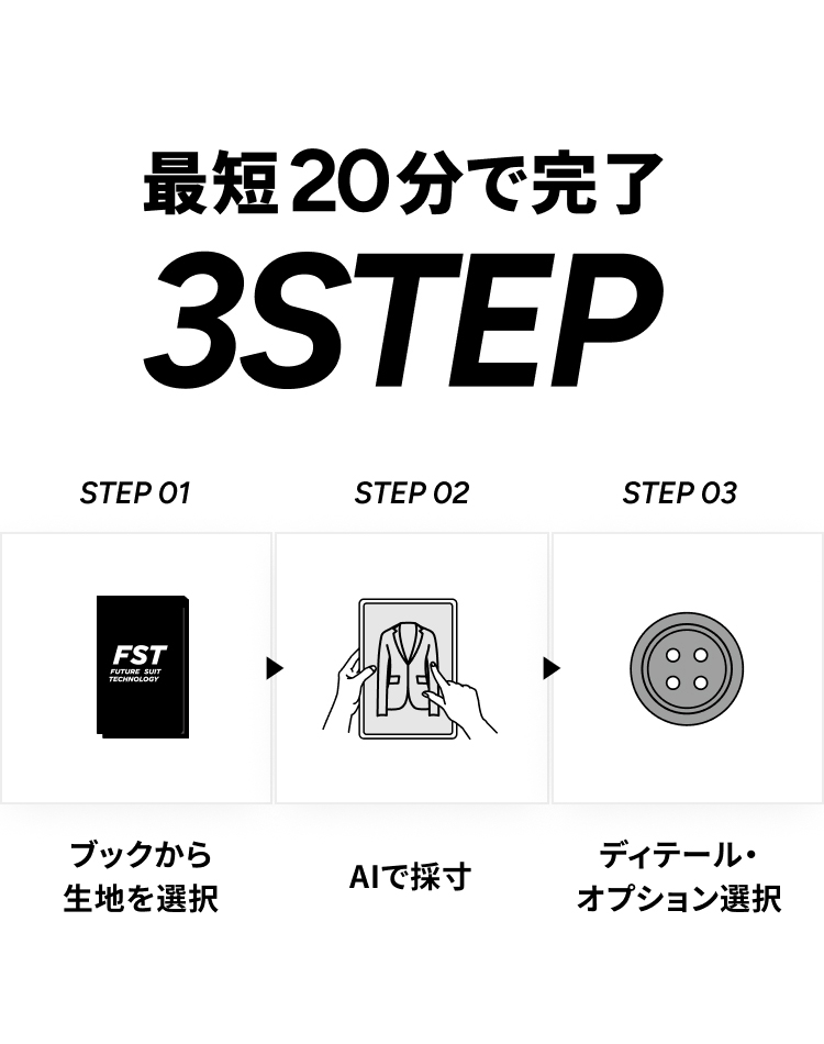 最後は、撮影するだけのカンタンAI採寸。それは、シンプル、イージー、フレンドリーなオーダースーツの未来形。クオリティもコストもプロセスも、ハイパフォーマンスなスタイル、はじまる。さあ、FSTで、いつかつくる一着を、いますぐつくる一着に。